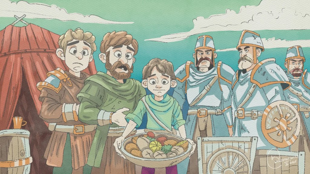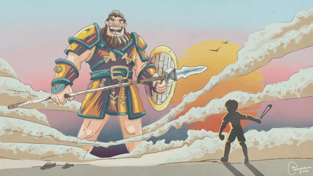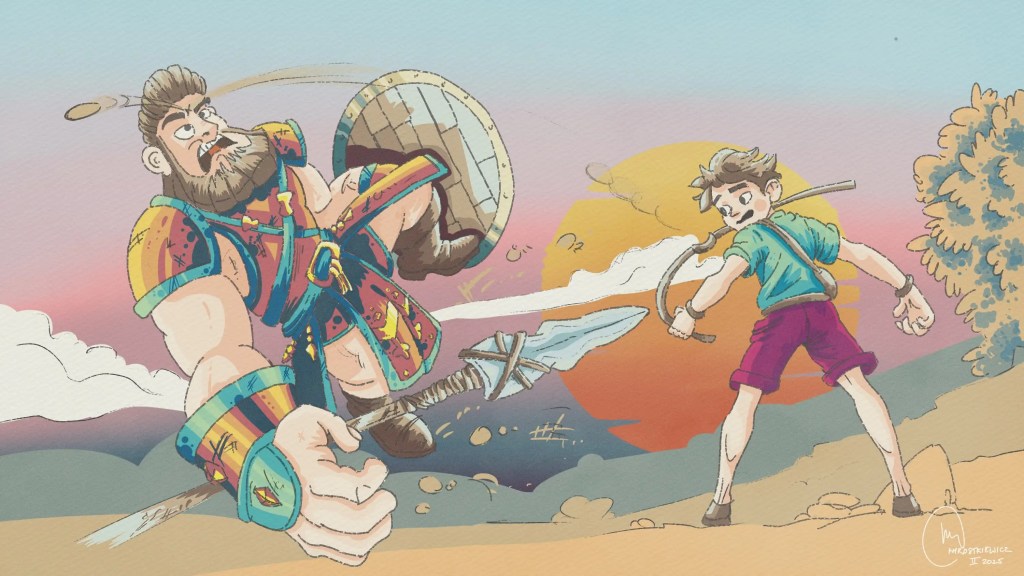 A long time ago, the Israelites were at war with the Philistines. The armies gathered on two hills, with a valley between them. The Philistines had a warrior named Goliath, who was a giant! He was over nine feet tall, wore heavy armor, and carried a huge spear. Every day, Goliath came out and shouted to the Israelites, “Choose someone to fight me! If he wins, we’ll be your servants. But if I win, you’ll be our servants!” The Israelites were terrified. No one dared to fight Goliath. One day, a young shepherd boy named David came to the battlefield. David wasn’t a soldier. He was there to bring food to his older brothers, who were in the army. When David heard Goliath’s challenge, he was shocked. “Why is no one fighting this man?” he asked. “We have God on our side!” David told King Saul, “I’ll fight Goliath!” Saul looked at him and said, “You’re just a boy. How can you fight such a giant?” But David said, “I take care of my father’s sheep. When lions or bears attack, I fight them off to protect the sheep. God kept me safe then, and He’ll keep me safe now. ” Saul finally agreed and gave David his armor. But it was too big and heavy for David. “I can’t wear this, ” he said. Instead, David took his shepherd’s staff, his sling, and five smooth stones from a stream. David walked out to face Goliath. When Goliath saw him, he laughed. “Am I a dog that you come at me with sticks? Come here, and I’ll crush you!” But David didn’t back down. He shouted, “You come at me with a sword and spear, but I come at you in the name of the Lord! Today, God will help me defeat you, and everyone will know that He is the true God. ” Goliath charged at David, but David stayed calm. He put a stone in his sling, spun it around, and let it fly. The stone hit Goliath right in the forehead. The giant fell to the ground with a loud crash! David ran over, took Goliath’s sword, and made sure the battle was over. When the Philistines saw their champion was defeated, they ran away. The Israelites cheered and chased them off. David became a hero that day, not because he was the strongest or the biggest, but because he trusted God. He believed that no problem, no matter how big, was too hard for God to handle. This story teaches us that even when we face challenges that seem impossible, we can trust God to help us. Like David, we don’t need to be the strongest or the tallest. We just need faith, courage, and the belief that God is always with us.